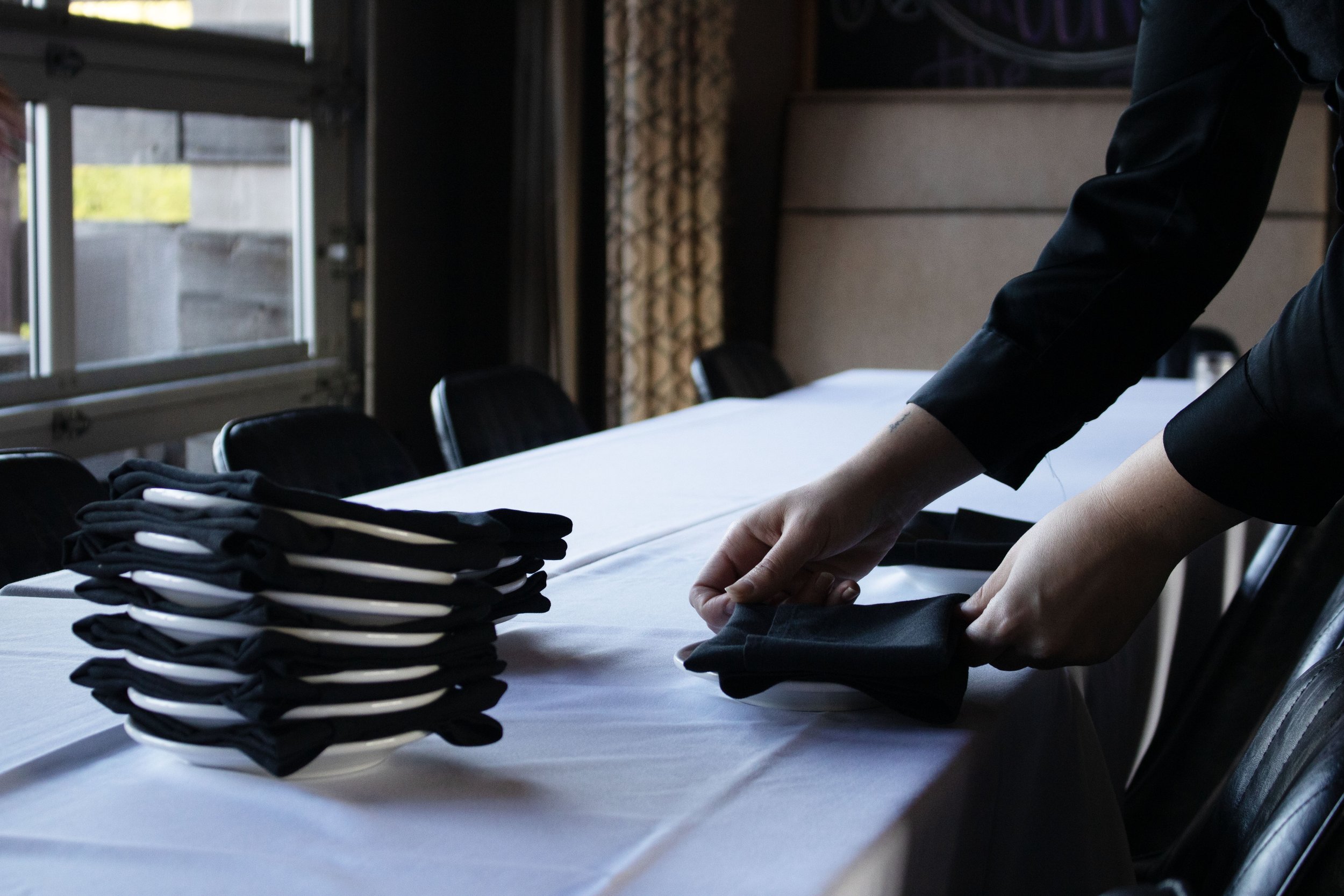 04_PROFILE_BRADLEY_2858 Plates stacked, napkins folded, and utinsils ready to be layed out, Marina preps the business meeting table set in the corner of the dining room. She delicately assigns each seat with its respective dining necessities. Queenie's Steakhouse, Denton, TX 11/16/2024
